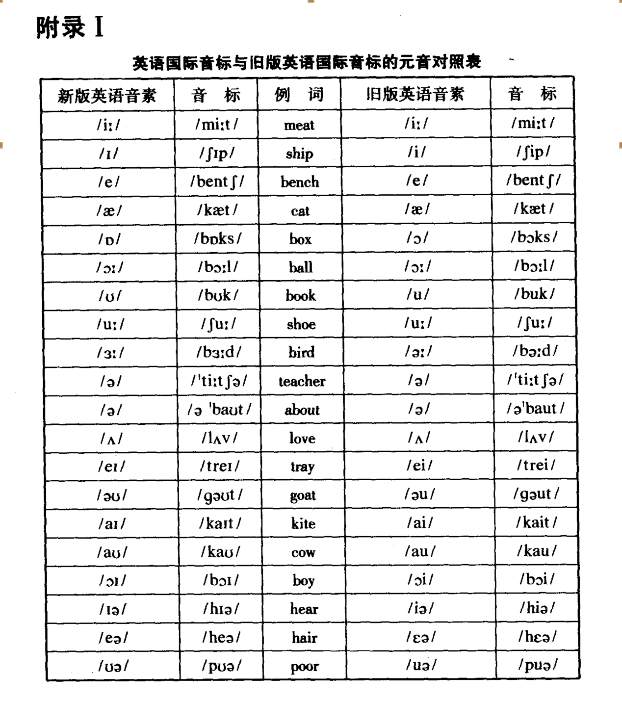 说明: 元音方面, 美音与英音的区别有以下五点: 1. 美语中/e/、/o/虽然以单元音的形式出现, 但在本书中被归入双元音。分别与英语双元音/eɪ/ /əʊ/对应。 2. 音素/a/不论是在英音还是在美音中都不单独发音, 只出现在