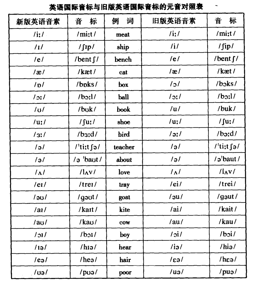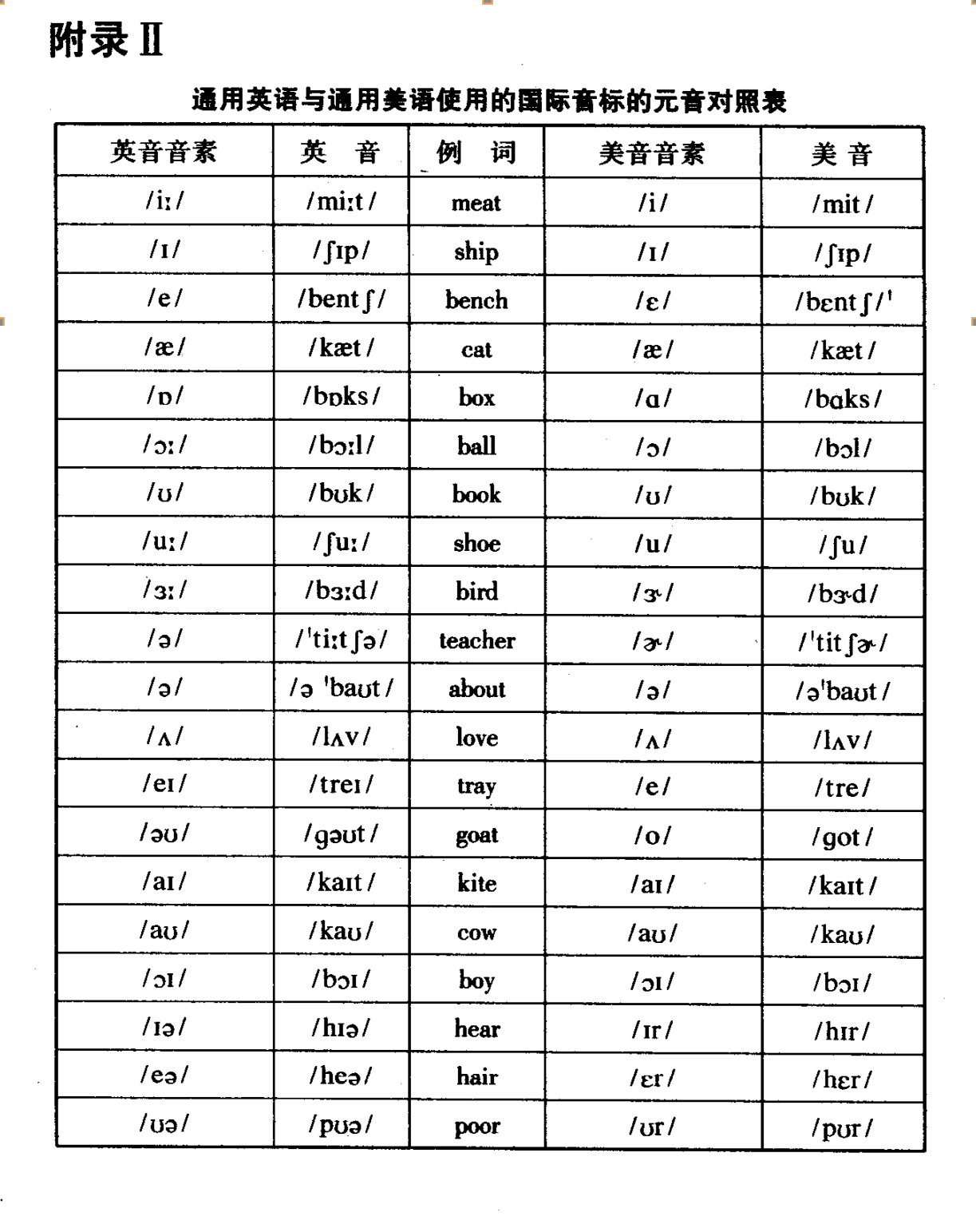 通用英语与通用美语使用的国际音标的元音对照表
